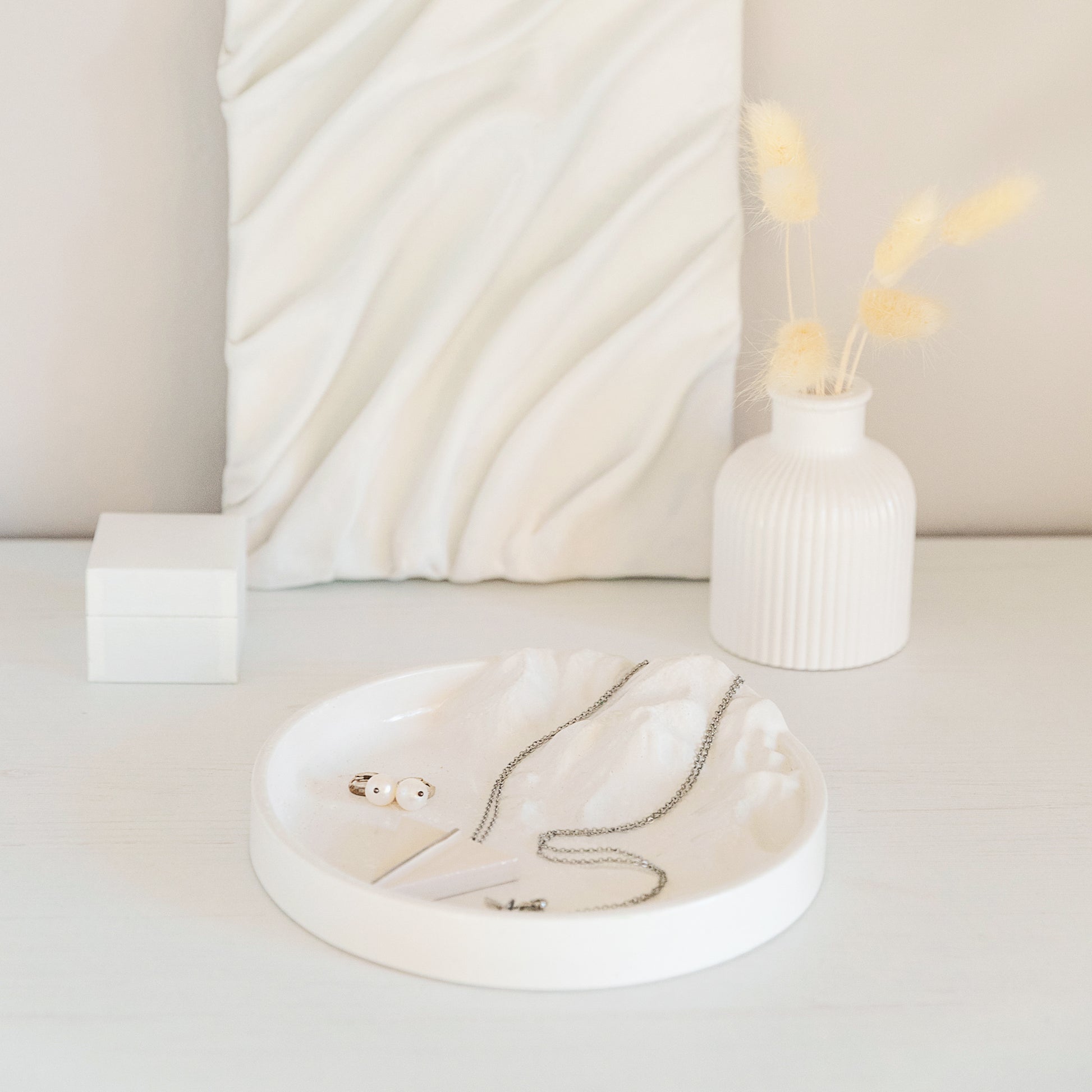 Entdecken Sie unser außergewöhnliches Gips-Tablett mit Bergrelief – ein einzigartiges Refugium für Ihre geschätzten Düfte und wertvollen Schmuckstücke. Genießen Sie die Eleganz dieses exquisiten Tabletts, das speziell entworfen wurde, um Ihre Lieblingsparfums oder geliebten Accessoires zur Schau zu stellen. Verwandeln Sie Ihren Raum in ein persönliches Paradies und heben Sie Ihre Dekoration mit dem atemberaubenden Relief der Berge auf unserem eleganten Gips-Tablett hervor!