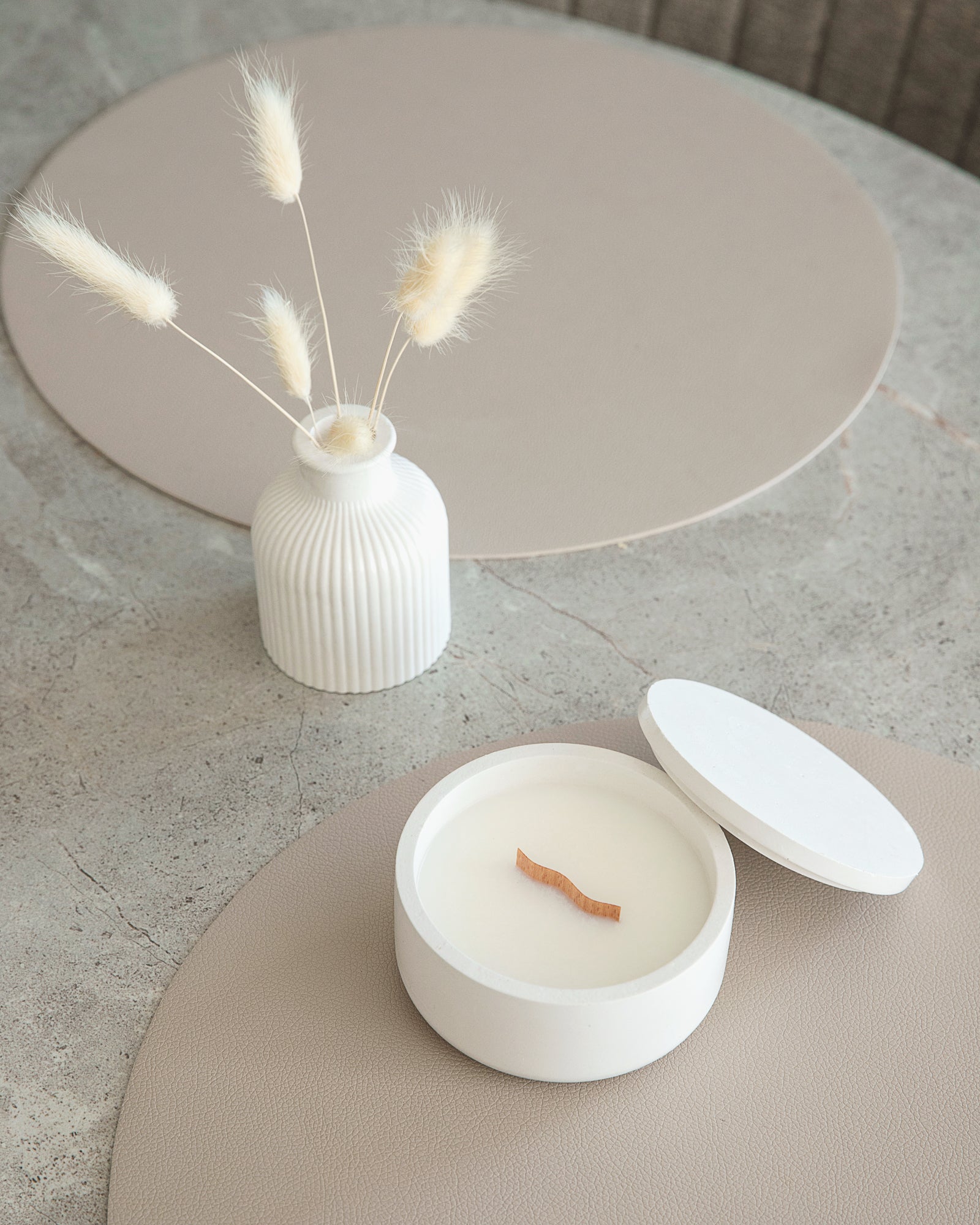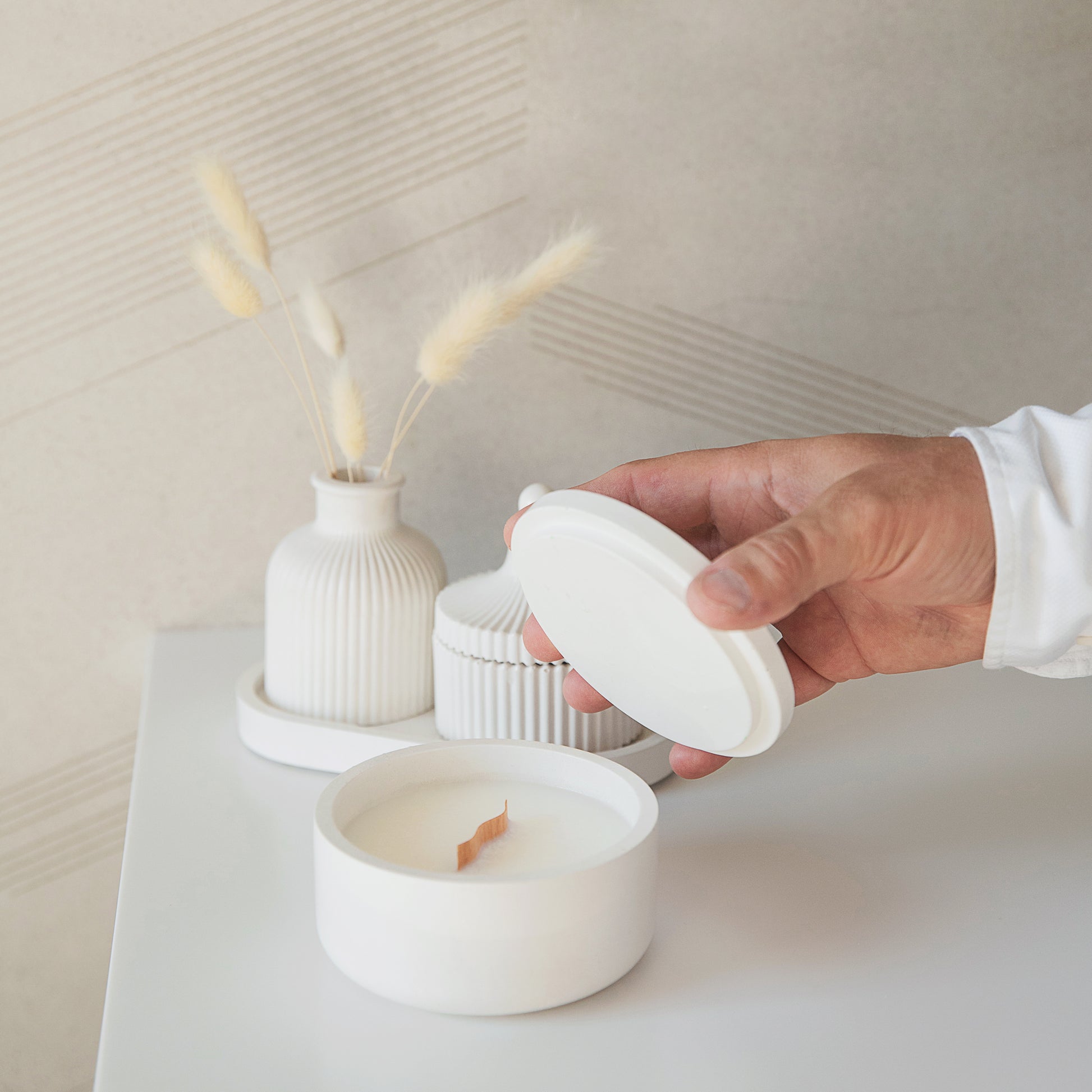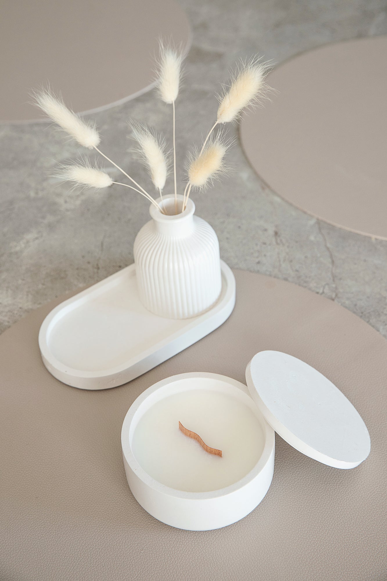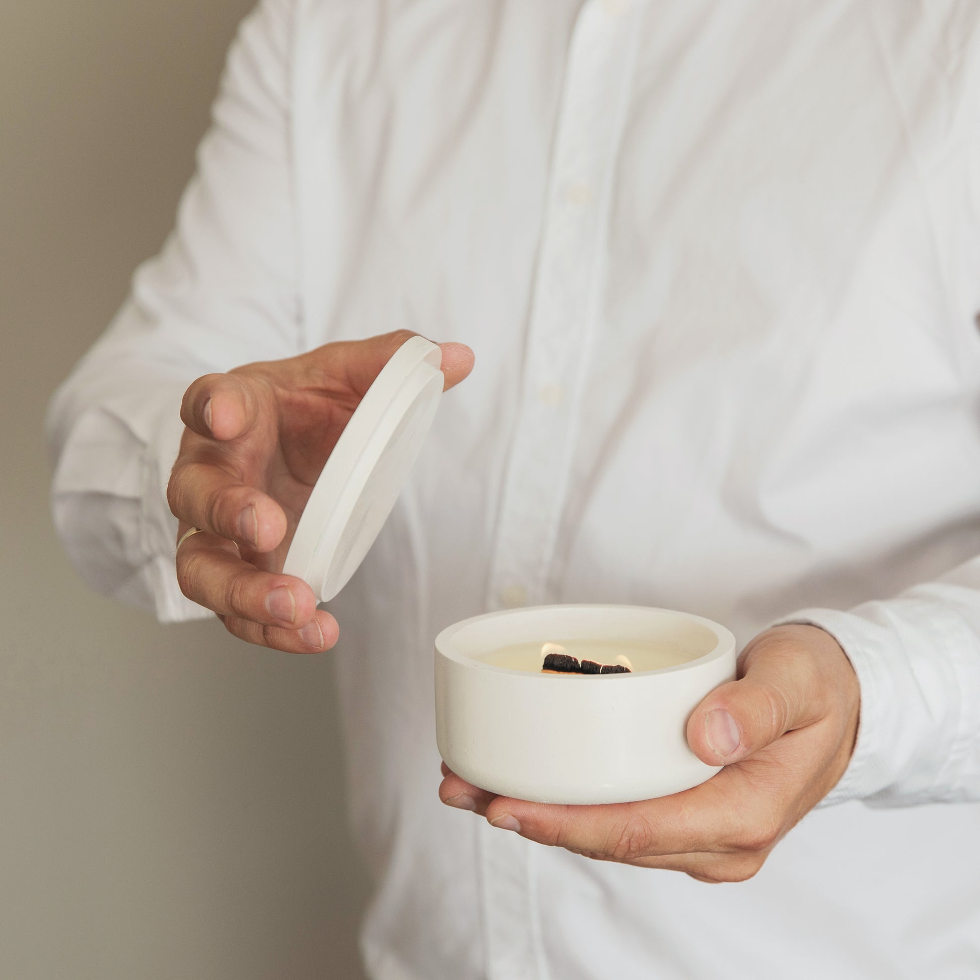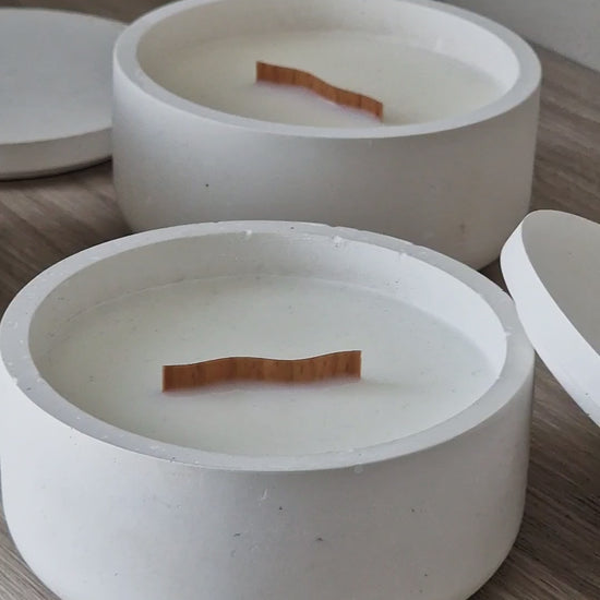 Duftkerze mit Holzdocht in handgefertigtem Gipsgefäß, Kokoswachs